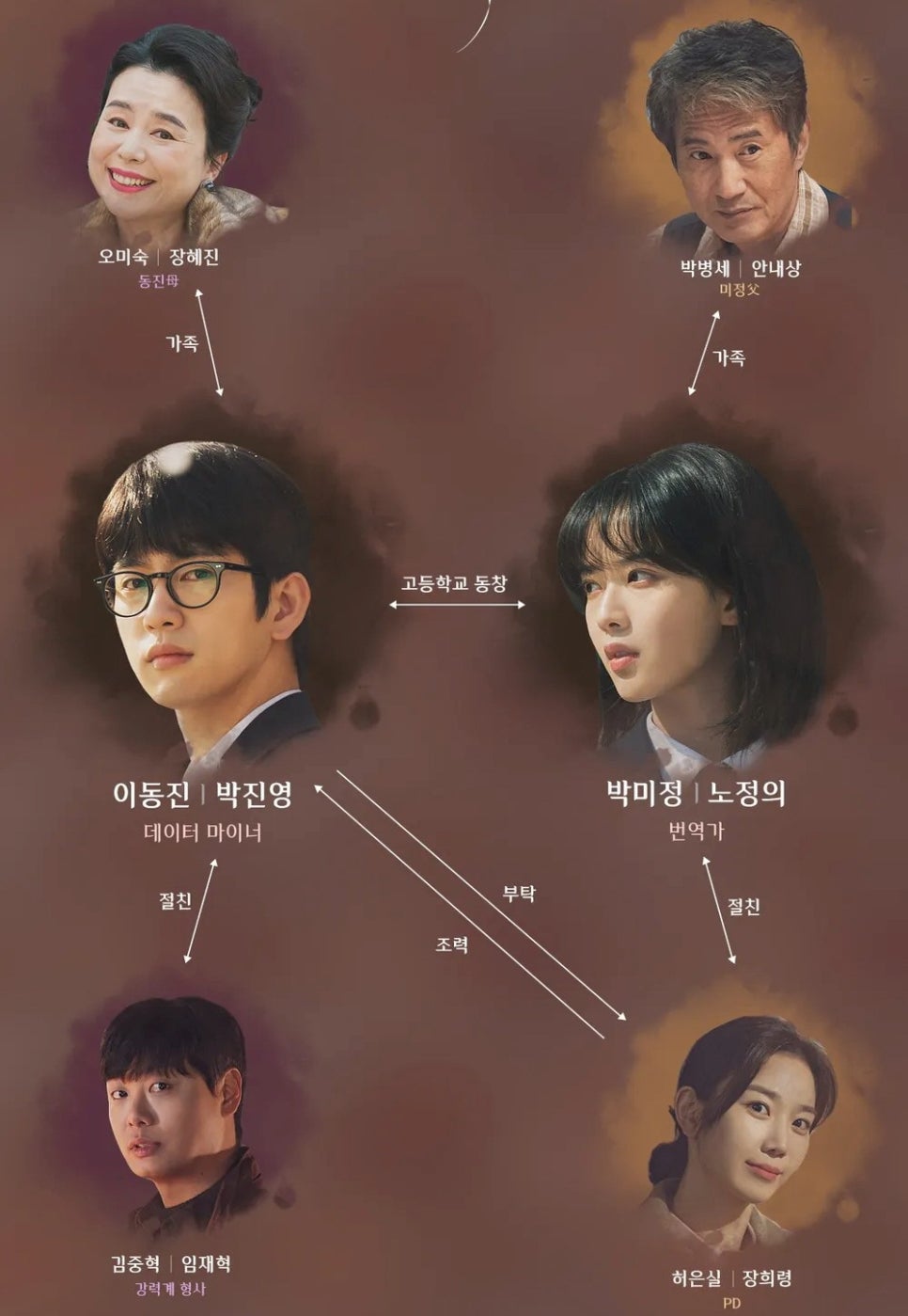 극 중 등장인물관계도를 살펴보면, 이동진(박진영)을 중심으로 박미정(노정의), 김중혁(임재혁), 허은실(장희령)이 서로 얽히고설킨 이야기를 이끌어갑니다. 이동진은 과거 학교 시절부터 미정을 안타깝게 여겨, 그녀에게 씌워진 불운의 법칙을 ‘통계학적 착각’으로 풀어내려 애쓰지만 끝내 실패하고, 이후 10년 만에 재회하는 서사를 갖습니다. 김중혁은 무뚝뚝하면서도 속마음을 잘 드러내지 않는 강력계 형사로, 이동진의 유일무이한 친구입니다. 허은실은 “박미정을 둘러싼 온갖 오해 속에서도 주저 없이 먼저 다가간 인물”로, 매사에 솔직함을 넘어 팩트 폭격을 날려버리는 당돌한 캐릭터로 설정돼 있습니다.