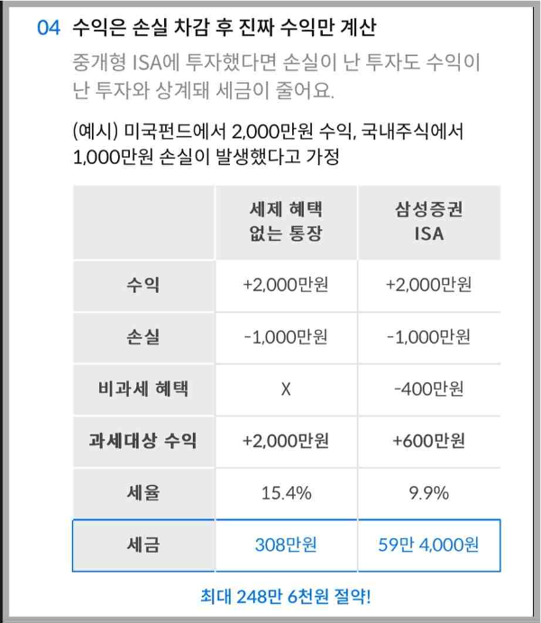 - ISA 계좌: 전체 손익을 합산하여 세금 부과(절세 효과)