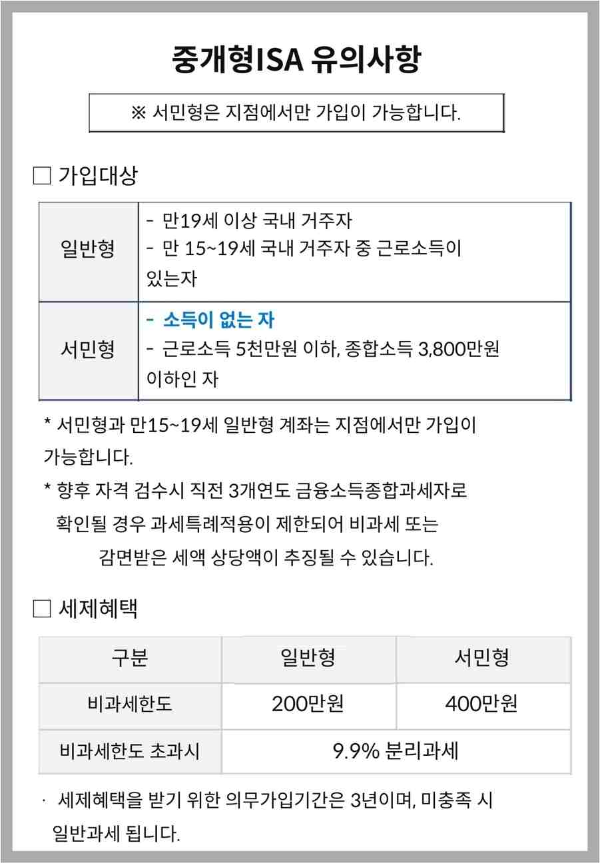 - 서민형은 비대면 개설 불가: 서민형 계좌의 경우, 대면 계좌 개설만 가능한 점을 유의해야 합니다.