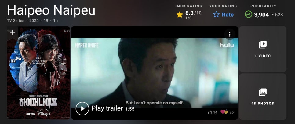 2025년 3월 19일 공개된 디즈니+ 오리지널 드라마 <하이퍼나이프(Hyper Knife)>는 공개 직후 국내 디즈니플러스 종합 콘텐츠 순위 1위에 오르며 단숨에 화제작으로 떠올랐습니다.