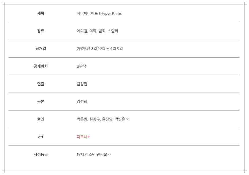 디즈니+ <하이퍼나이프>는 단순한 스릴러물이 아닙니다. "무엇이 의사이고, 무엇이 살인자인가" "인간의 생명을 구하는 능력과, 그것을 파괴하는 충동이 공존할 수 있는가"라는 묵직한 질문을 던집니다. 강렬한 설정, 속도감 있는 전개, 배우들의 몰입감 있는 연기까지. 지금 이 작품을 주목하지 않을 이유가 없습니다.